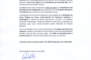Lire la suiteInvitation à la Déclaration solennelle du Prince Kum’a Ndumbe III, le 07 juin 2018