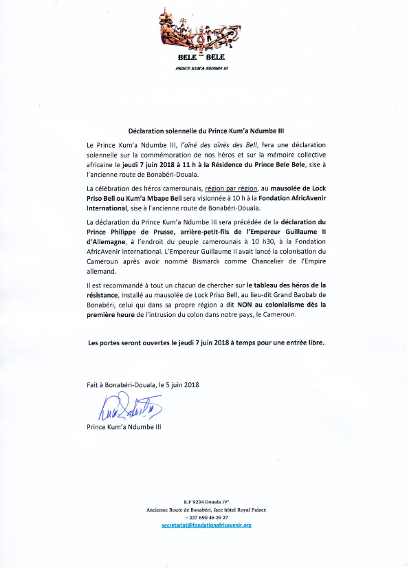 Invitation à la Déclaration solennelle du Prince Kum’a Ndumbe III, le 07 juin 2018