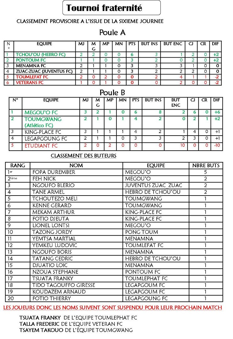 La sixième journée vient de rendre son verdict , c’était ce dimanche 31 Mars *shiazeme* sur le calendrier traditionnel Ngiemboon . Et c’est dans une forte pluie qui a arrosé le stade national du Caire immobisant les nombreux supporters (dans les tribunes et cabine) pendant les premières 45 minutes , on dirait annonciatrice de la bonne nouvelle pour le secteur legapgoung ( *Bambi FC* ) qui en profitera pour gifler l’équipe de *L’ACEEBY* sur un score lourd de 03 but contre 0 . On retient également cette inclinaison de l’équipe de la chefferie *king place FC* , avec sa mauvaise sortie face à *Megouo’o FC* qui lui a damé le pion 01 but contre 0 lors de la deuxième rencontre du jour .