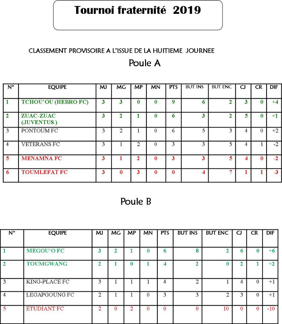 Tournoi de la fraternité de la COBY: résultats de la 8eme journée, ce samedi 13 avril 2019