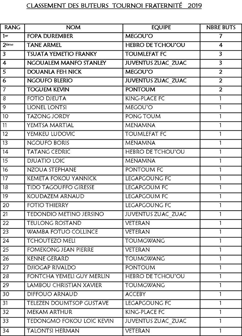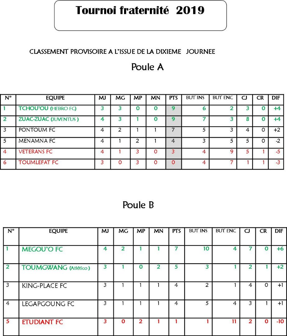 Tournoi de la fraternité COBY : classement de la 10ème journée