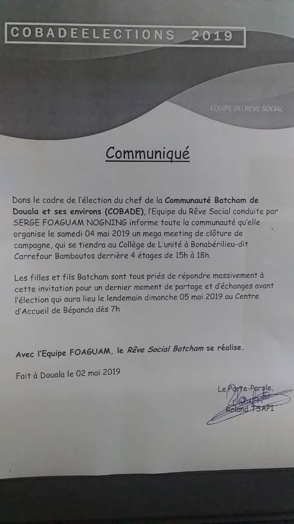 Dans le cadre de l’élection du chef de la Communauté Batcham de Douala et ses environs (COBADE), l’Equipe du Rêve Social conduite par SERGE FOAGUAM NOGNING informe toute la communauté qu’elle organise le samedi 04 mai 2019 un mega meeting de clôture de campagne, qui se tiendra au Collège de L’unité à Bonabéri lieu-dit Carrefour Bamboutos derrière 4 étages de 15h à 18h.