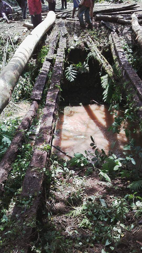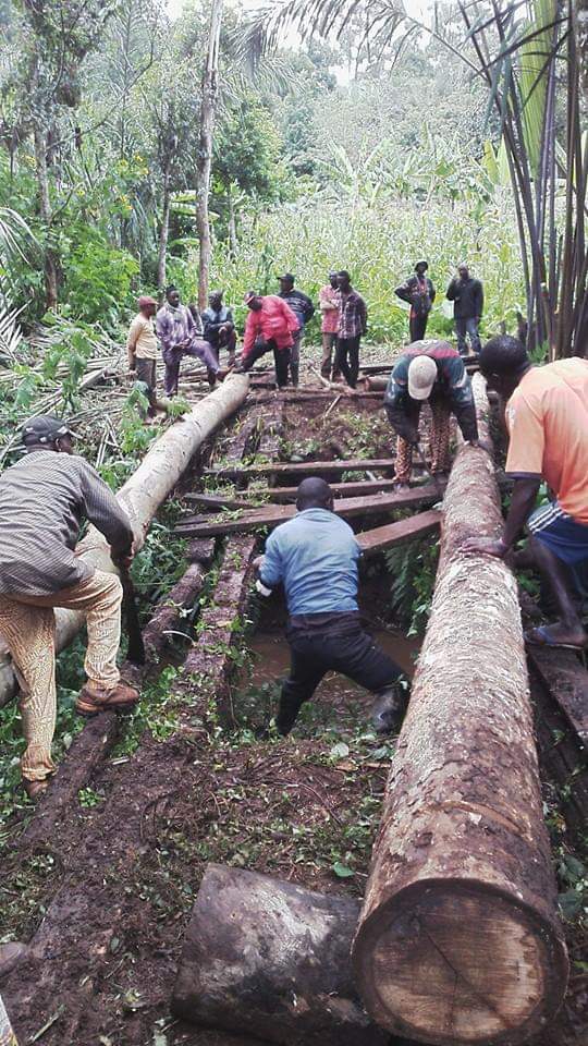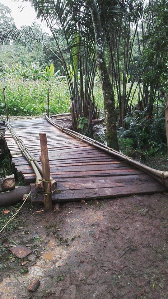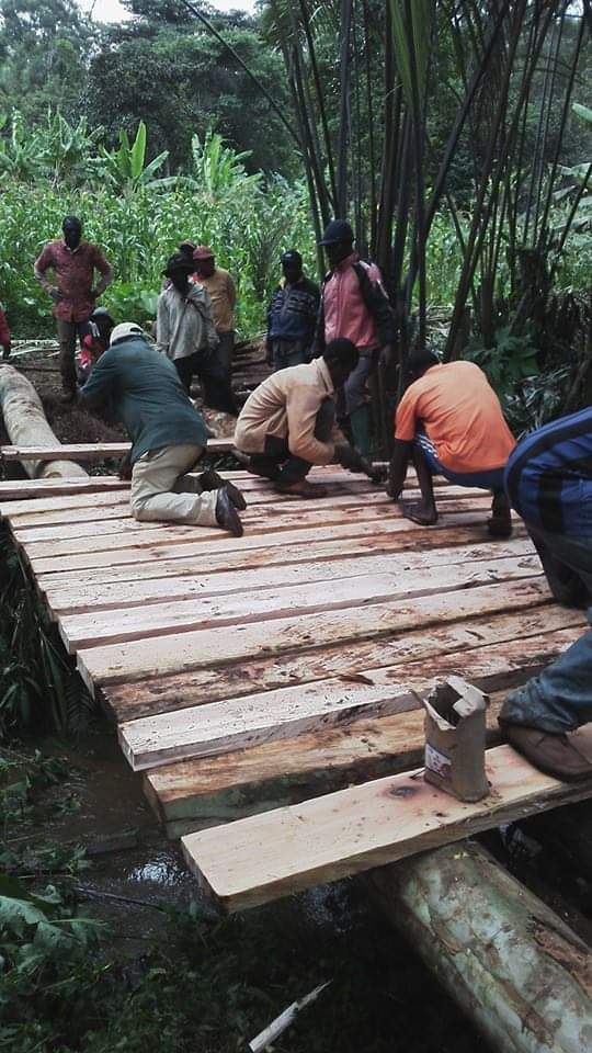 Par Nde Mekemdjeulong ( L’un des 7 meneurs des Ngiemboon jusqu’à Nzie). Avant les Batcham posait les bambous de la base, les Balessing posait la 2ème couche, les Bamougoung la 3ème couche, les Bangang le dessus ou la dernière couche. Comme le lit du cours d, eau a grandi, on coupe les grands toncs d, arbres et on pose sur les 2 bords de rive et clouer les planches dessus. Chaque année les notables des royaumes Ngiemboon se réunissent pour attacher 7 bambous avec 7 lianes d, un côté et 9 bambous avec 9 lianes de l, autre côté du pont. C, est quand les trons d, arbres pourrissent après quelques années qu, on les échange. Les ” pouola’. ” demandent qu, on construit un pont moderne définitif pour ne plus changer les troncs d, arbres qui sont rares de temps en temps et y clouer les planches.