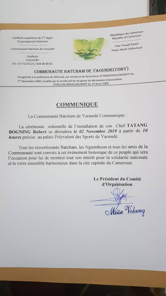 Communiqué COBY : l’installation du Chef de la Communauté Batcham de Yaoundé aura lieu le 02 novembre 2019 Partager tweet