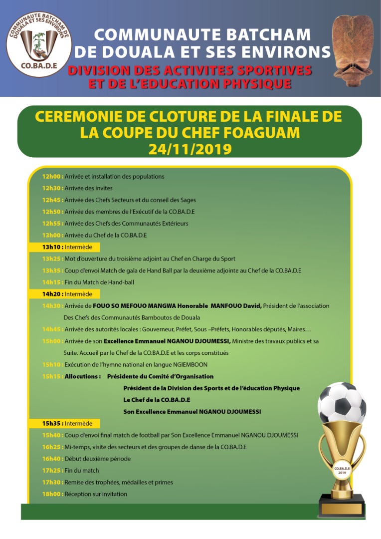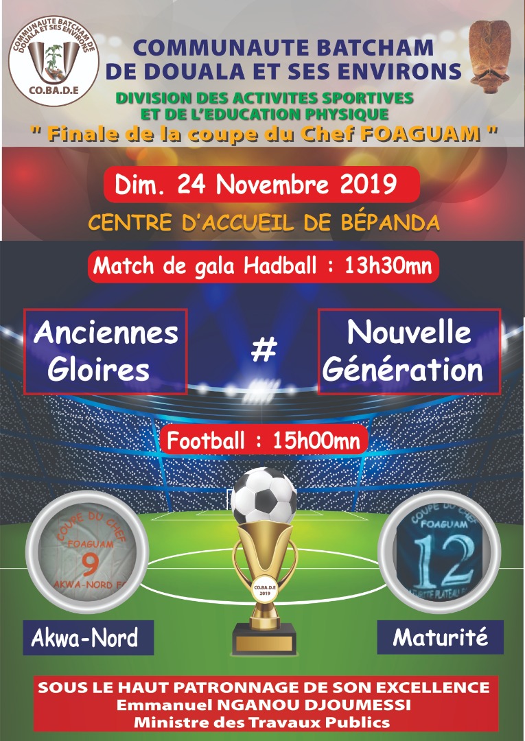 La Communauté Batcham de Douala et ses environs ( *COBADE* ) est informée que la finale de la *Coupe du Chef FOAGUAM* , se jouera sous le haut patronage du ministre des Travaux Publics, Son Excellence *EMMANUEL NGANOU DJOUMESSI,* le 24 novembre 2019 au Centre d’Accueil et d’Observation de Bépanda.