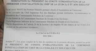 *INSTALLATION DU CHEF DE LA COMMUNAUTÉ BATCHAM DE DOUALA ET SES ENVIRONS (CO.BA.D.E)** *IMPORTANTE DÉCISION DU CHEF FOAGUAM NOGNING SERGE*