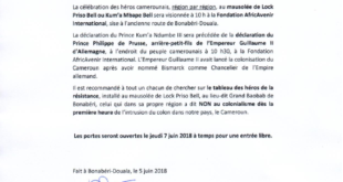 Invitation à la Déclaration solennelle du Prince Kum’a Ndumbe III, le 07 juin 2018